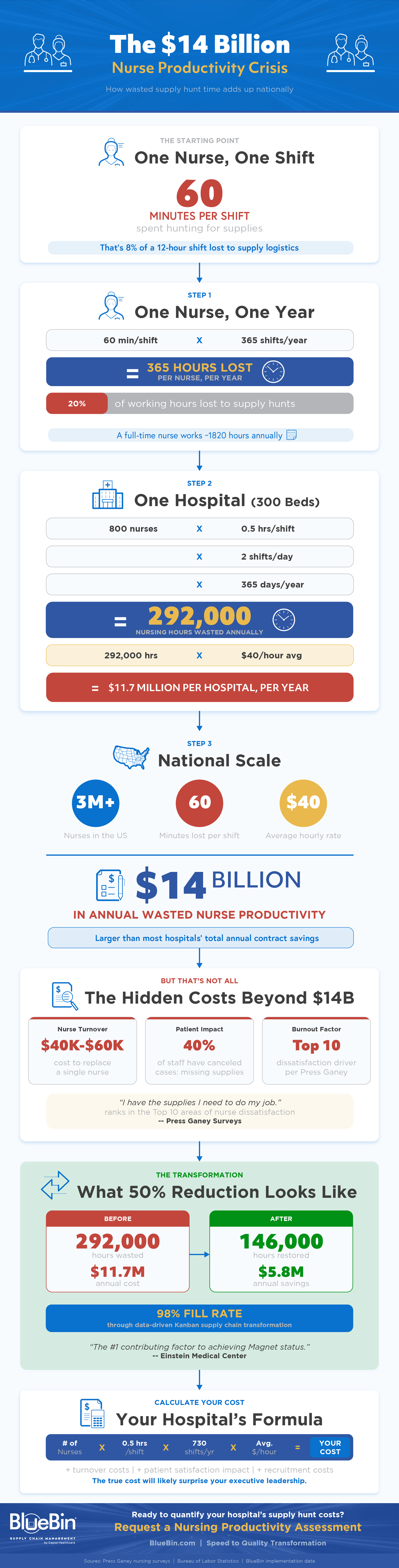 Nurses waste up to 60 minutes per shift hunting for supplies. In a 12-hour shift, one full hour, 8% of their time, is lost to searching for items that should be readily available.